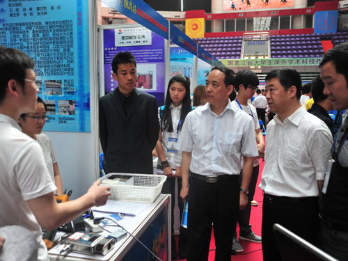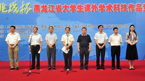 黑龙江省教育厅督学李云增,黑龙江省科技厅副厅长郭大春,黑龙江省科学院副院长王钢,哈尔滨理工大学副校长武俊峰,哈尔滨理工大学校长助理孟庄,团省委常委、学校部部长关大辉,省学联驻会执行主席宋佳玉出席开幕式,团省委副书记陈凯云主持挑战杯开幕式。来着全省各高校师生代表800余人齐聚我校体育馆,共享这一科技盛事。今年省级竞赛共收到参赛作品980件,其中586件作品进入复赛,共有211件作品进入了决赛。决赛作品涉及法律、管理、教育、经济、社会、机械与控制、信息技术、数理、生命科学、能源化工等多个领域,竞赛设置了参赛作品的现场展示、现场问辩、微博互动、企业创投对接、企业家观摩等环节。本次竞赛将最终评选出一、二、三等奖、优秀奖以及参加全国比赛的作品。