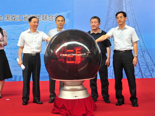 黑龙江省教育厅督学李云增,黑龙江省科技厅副厅长郭大春,黑龙江省科学院副院长王钢,副校长武俊峰共同启动开幕式启动球