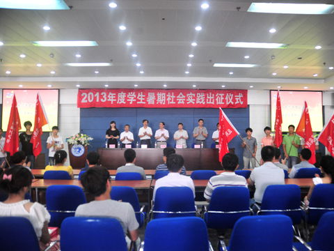 7月10日,学校以“实践激扬青春志,奋斗成就中国梦”为主题的2013年学生暑期“三下乡”社会实践活动出征仪式在一号楼多功能厅举行。副校长武俊峰出席会议,校长助理孟庄、组织部部长张永军、学工部部长、学生处处长满春涛、宣传部部长肖庆生、招生就业处副处长高山,各学院团总支书记、社会实践团队指导教师及100余名实践团队成员代表参加了出征仪式。仪式由校团委书记单鹂娜主持。