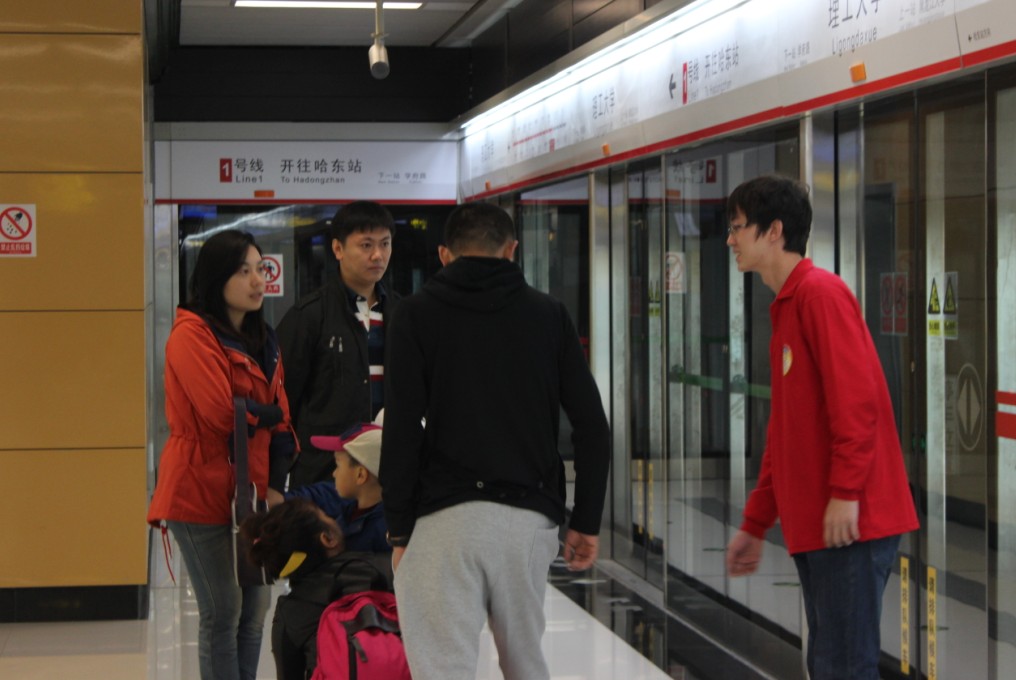 “人工售票、兑换零钞请到前方地铁服务站”、“列车即将到达,为了您的安全请站在黄线外”……“十一”黄金周期间,志愿者们每天要把这些话重复数百次。同时他们每天还要为百余人次乘客指引如何买票、如何过闸门、从哪个入口进站台等相关乘车问题。此外,我院的志愿者还协助工作人员监督和制止在车厢内吃零食、吸烟、乱扔垃圾等不文明行为,共同维护乘车环境。虽然“十一”黄金周期间的客流量很大,但地铁站里却一直井然有序。因为这里有为方便乘客而放弃假期的地铁站务人员和志愿者们,正是他们对乘客的指引疏导,保证了国庆节期间哈市地铁站内的井然有序。