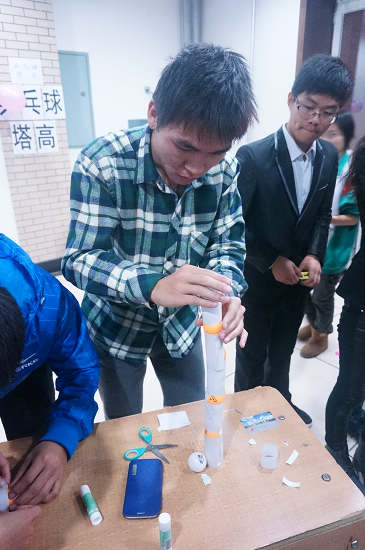 本次竞赛设有四个环节——纸环拉力、乒乓球塔高、直线车和纸飞镖扎气球,共有14只代表队参加竞技。各项活动异彩纷呈,竞争激烈。纸环拉力比赛中来自各个学院的同学们争先恐后。争取一张纸,几个订书钉在十秒中创造力量的奇迹。乒乓球塔高的比赛是最考验团结合作精神的一项活动。他们用科学原理阐述了实力铸就高度,创新成就深度。直线车和纸飞镖扎气球也同样考验了同学们的创新能力及动手能力。大家在比赛中各显身手,充分展现了当代大学生的科技素质。 最后经过激烈的角逐共有十只代表队获得胜出。