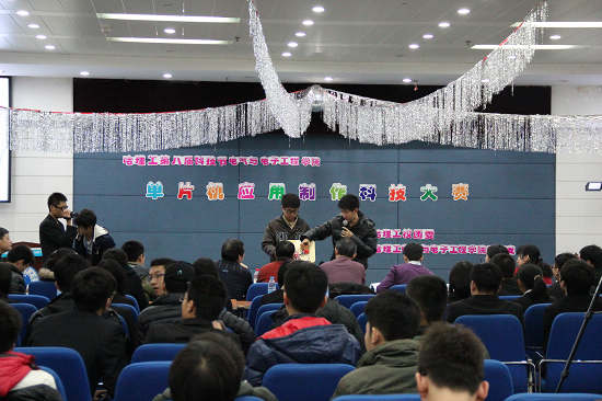为秉承我校科技节“崇尚科学、追求真知、勤奋学习、锐意创新、奋发成才”的优良传统,深入开展科技创新活动,增强学生科技创新意识, 弘扬科学精神,培养学生一种合作、创新、探索、求实和追求学术真知的精神,提高学生实践动手能力,展示我校学生丰富多彩的课外学术科技活动成果,为培养高素质创新型人才奠定基础,增强学生的就业竞争力,让青春梦想以科技为支点,扬帆起航。由校团委主办、电气学院团总支承办的第八届科技节“单片机应用制作大赛” 于11月30日中午12:30在一号楼多功能厅成功举办。担任此次比赛和评委有:电气学院副院长宋立新老师、电力电子教研室周永勤老师、电子信息工程系胡家华老师、电子信息工程系康守强老师。校团委书记单鹂娜老师、电气学院党委副书记兼副院长杨芳老师、校团委姜国玉老师、学院全体辅导员,各学院团总支副书记、13级新生出席了此次大赛。