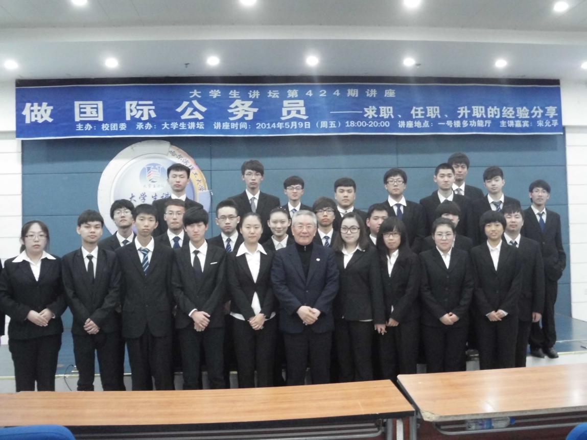 2014年5月9日,在哈尔滨理工大学一号楼多功能厅,原世界卫生组织资深外交官、中国联合国协会会员、卫生部原外事司长——宋允孚先生与理工学子分享了他做国际公务员期间的求职、任职、升职的切身经验。