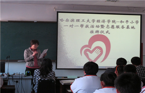 在哈尔滨理工大学经济学院青年志愿者协会与哈尔滨和平小学长时间的筹划和交流下,2014年5月27日,经济学院青协成员前往哈尔滨和平小学,举行了“哈尔滨理工大学-和平小学一对一帮扶活动启动仪式暨哈尔滨理工大学经济学院志愿者实训基地挂牌仪式”的活动。和平小学马校长、经济学院党总支副书记马兰、团总支书记赵鹏举和范宇老师出席了本次活动。