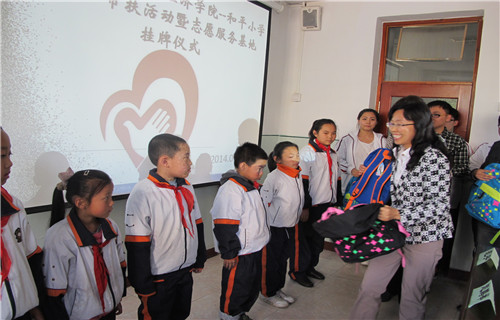 在同学们热烈的掌声中,和平小学马校长对出席活动的马书记、赵老师和范老师表示了热烈的欢迎,对参与本次活动的经济学院青年志愿者们长期以来对和平小学同学们的帮助表示了衷心的感谢,并希望能在未来的日子里有更多的公益合作。紧接着,马书记在讲话中指出“经济学院在注重教育之余,一直致力于社会公益实践,取得了一定的成绩,也得到了社会各界的认可,在未来的日子里志愿者们会一如既往的投身到公益活动当中。”在志愿者与和平小学学生代表的发言中,表达了两校共同建立“班对班帮扶”的畅想。活动尾声,可爱的弟弟妹妹们高兴的接过了志愿者们送去的新书包等学习用品,看到孩子们脸上的笑容,所有在场的志愿者和老师们都感到无比欣慰。