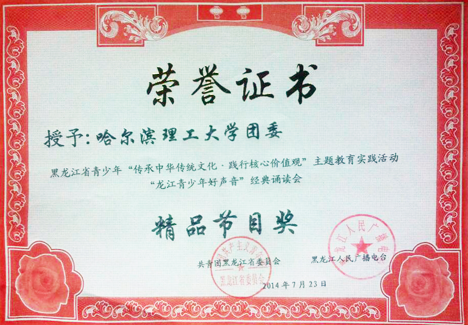 本次经典诵读活动以“弘扬传统文化,传承中华文明”为主题,践行社会主义核心价值观。由致敬青春、致敬时代、致敬祖国三个部分组成。哈尔滨理工大学、黑龙江大学等省内高校,黑龙江省机场集团、中航工业哈尔滨飞机工业集团、黑龙江省森林工业总局等单位参加活动。诵读内容主要以红色经典诗文和赞美家乡歌颂祖国为主题。我校选送的大型原创音诗画《大美理工》开篇登场,节目以走向复兴、美丽中国、大美理工、奋斗青春为主线,表达了理工学子爱党、爱国、爱校的挚子情怀以及为国家富强、民族复兴、人民幸福、社会和谐、母校发展的光明前景而不懈奋斗的青春责任与使命,同时向社会充分展示了理工青年最美声音。我校荣获“龙江青少年好声音”经典诵读会“精品节目奖”,参会7名学生均获“最佳表演奖”,同时崔卓君同学荣获“优秀组织奖”。黑龙江电视台新闻联播、黑龙江人民广播电台、人民网纷纷报道并全程播放。 (新闻联播链接http://news.hljtv.com/2014/0725/603533.shtml)