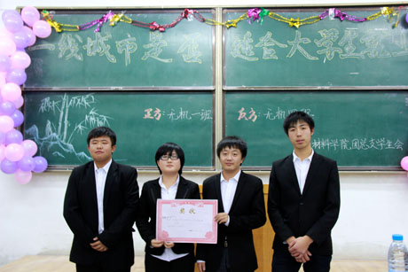 群雄舌战展雄风,争锋相对辩天下。为丰富学院学生的课余文化生活,增强大学生的思辨能力,材料学院团总支学生会于10月份开展了辩论赛活动。历经为期半月的初赛、复赛、半决赛的激烈角逐,万众瞩目的决赛于11月1日18:30在南区三号楼206拉开帷幕。材料学院团总支副书记、学生会副主席及各部部长出席了此次辩论赛。