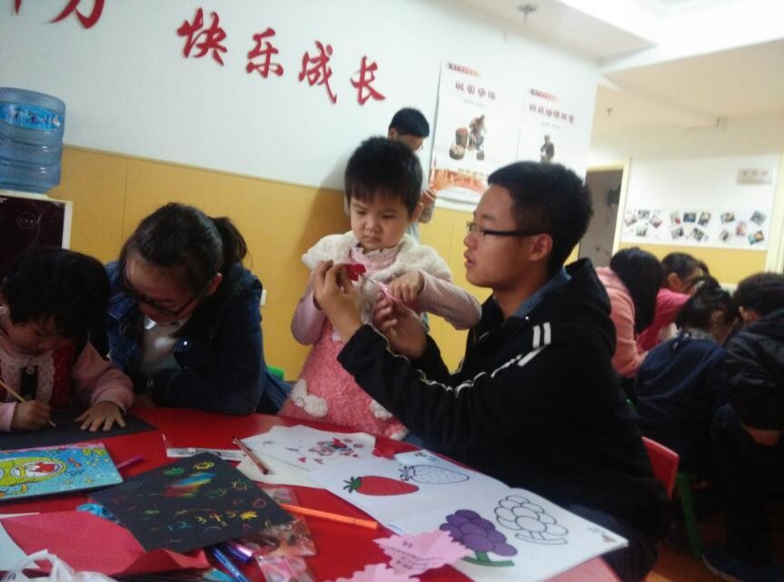 2014年11月2日,12名志愿者在学校里整装待发,带着为残障儿童精心准备的礼物前往残疾人康复中心。在老师和孩子热烈的欢迎下,志愿者们用画笔、拼图、涂画板和剪纸等物品,与孩子们一起做活动,手把手教他们剪卡片,叠青蛙,编纸花篮,制造纸飞机。还和孩子一起画画,陪孩子们一起做游戏,给孩子们营造正常孩子快乐的童年氛围,为他们带来了平时不曾有的欢乐。虽然孩子们患有先天性听力障碍,但在志愿者们耐心的陪同下,欢快的笑声荡漾在整个康复中心。快乐的时光总是短暂的,当志愿者准备离开时,孩子们无法用言语表达自己的感受,但是他们的眼眸中充满了留恋与不舍。他们虽然无法像正常的小朋友一样感受这个世界的美好,但却也能享受这个世界带给他们的温暖。