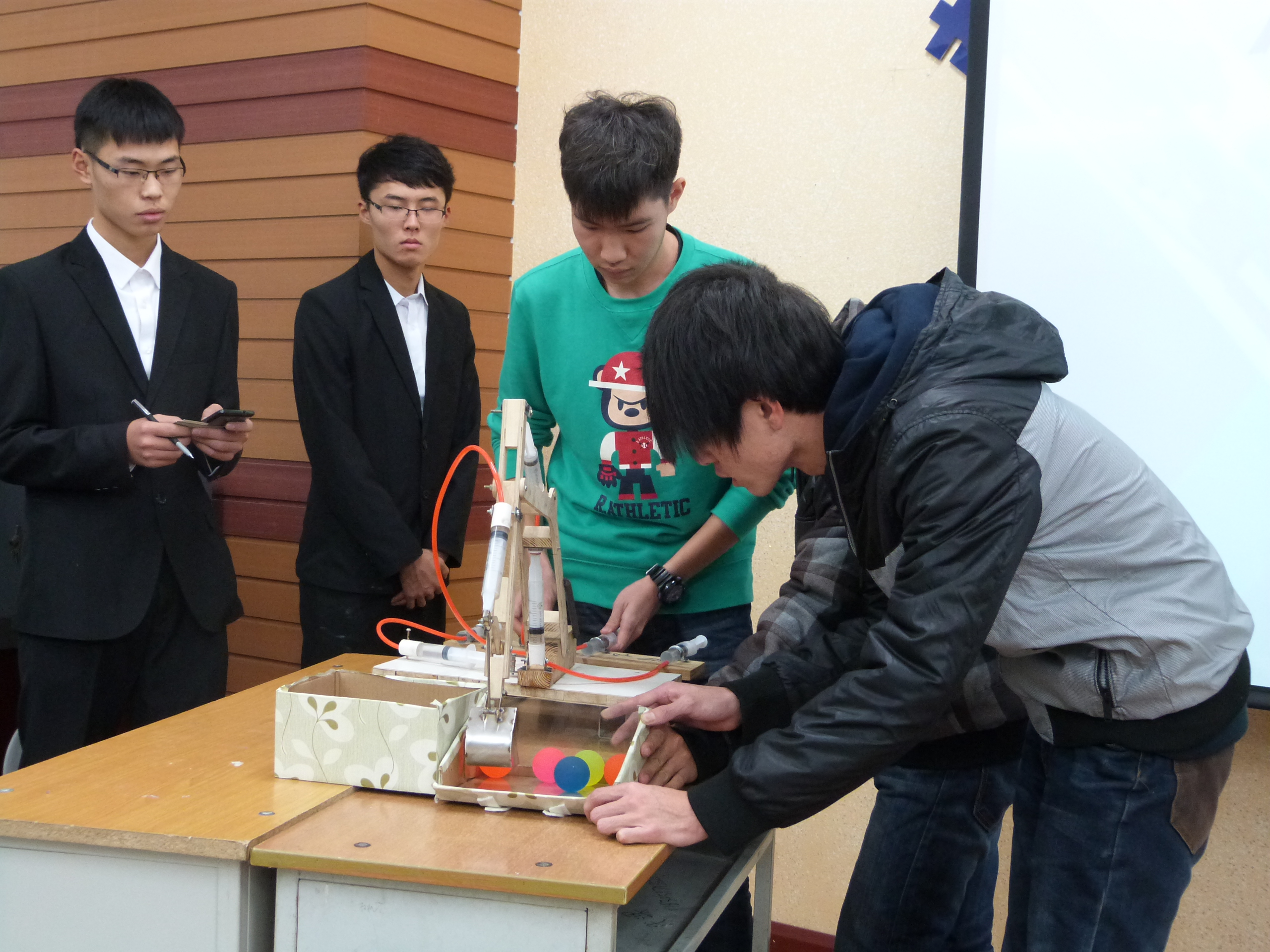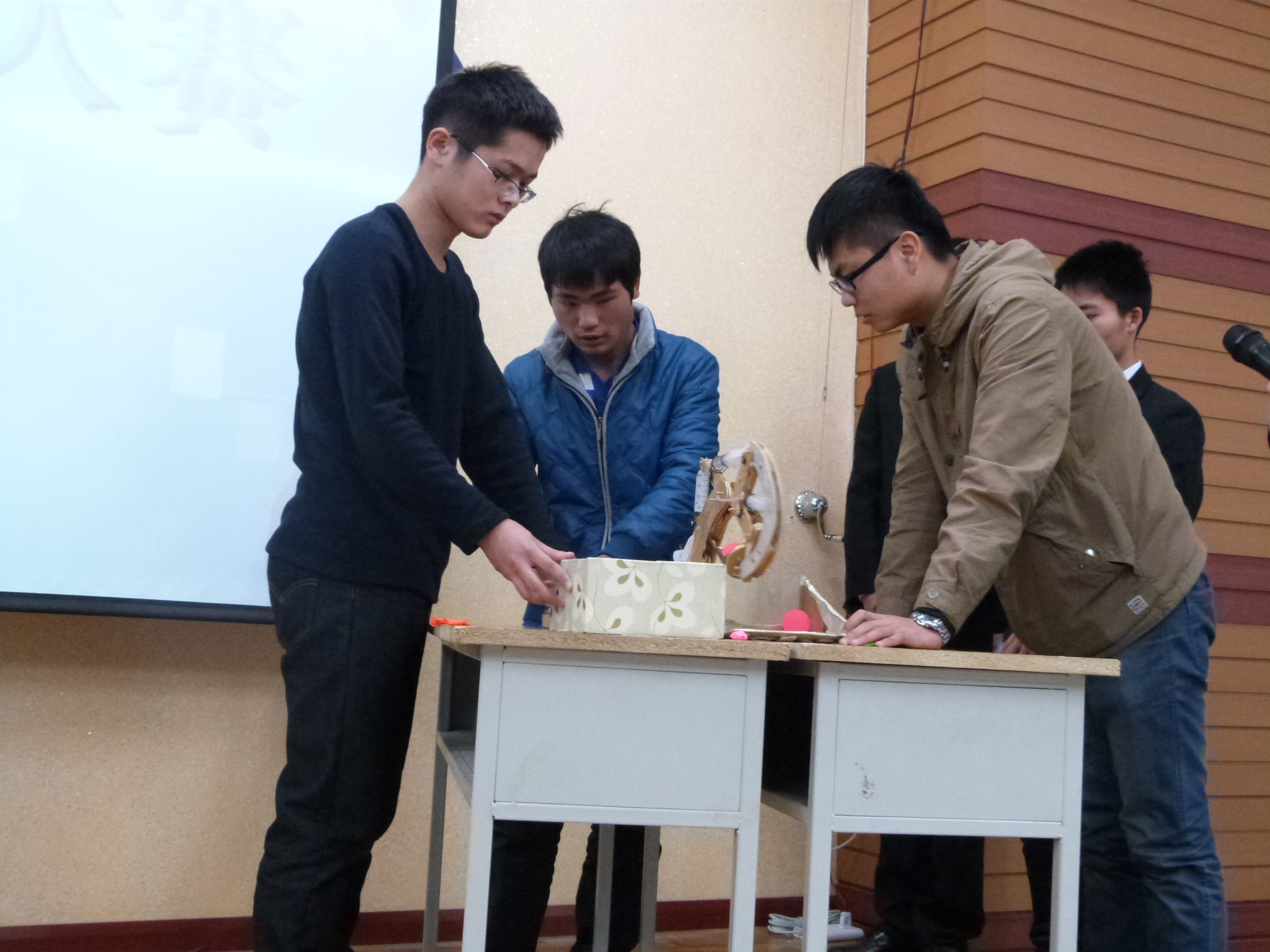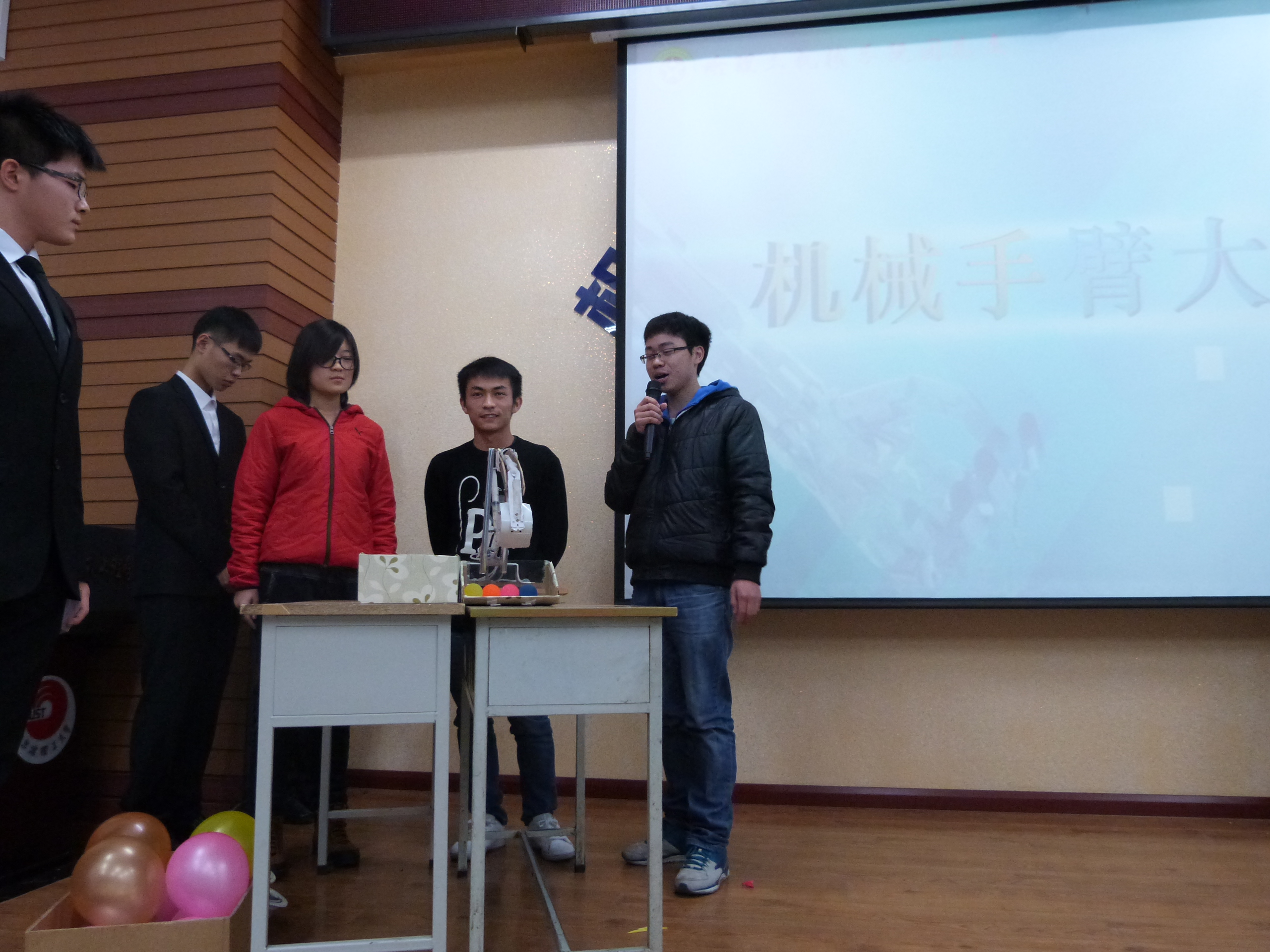 本次大赛共有300余人参加,经过层层选拔和激烈比拼,共有6组选手入围。本次大赛共分为两个项目,在一铲定音项目中,操作台上左右相邻放有两个纸盒,其中一个纸盒中放有五个小球。选手须每次从盒中取一球放入相邻的另一纸盒中内。在一触即发项目中,操作台上左右各放有一个气球支架,每个气球支架上盛有一个气球,选手须操作机械手臂左右轮换地将支架上的气球扎破。选手需要在规定的时间内完成两项任务,用时最短者即为获胜。此外,评委老师根据选手阐述自己设计的投掷机械的设计理念(包括创新理念、实用性、外形设计)进行创新奖和表现奖的评定。活动开始,选手使用各自的机械手臂有条不紊地搬运小球,争先恐后,十分激烈,每每到紧张时刻,大家都屏住呼吸等待结果。经过1个小时的激烈角逐,来自机械学院的威震天组合获得一等奖,来自机械学院的机械boys队及来自电气学院的旭涛组合获得二等奖,来自测通学院的3S队、材料学院的开拓者队、测通学院的理工蓝翔队获得三等奖。