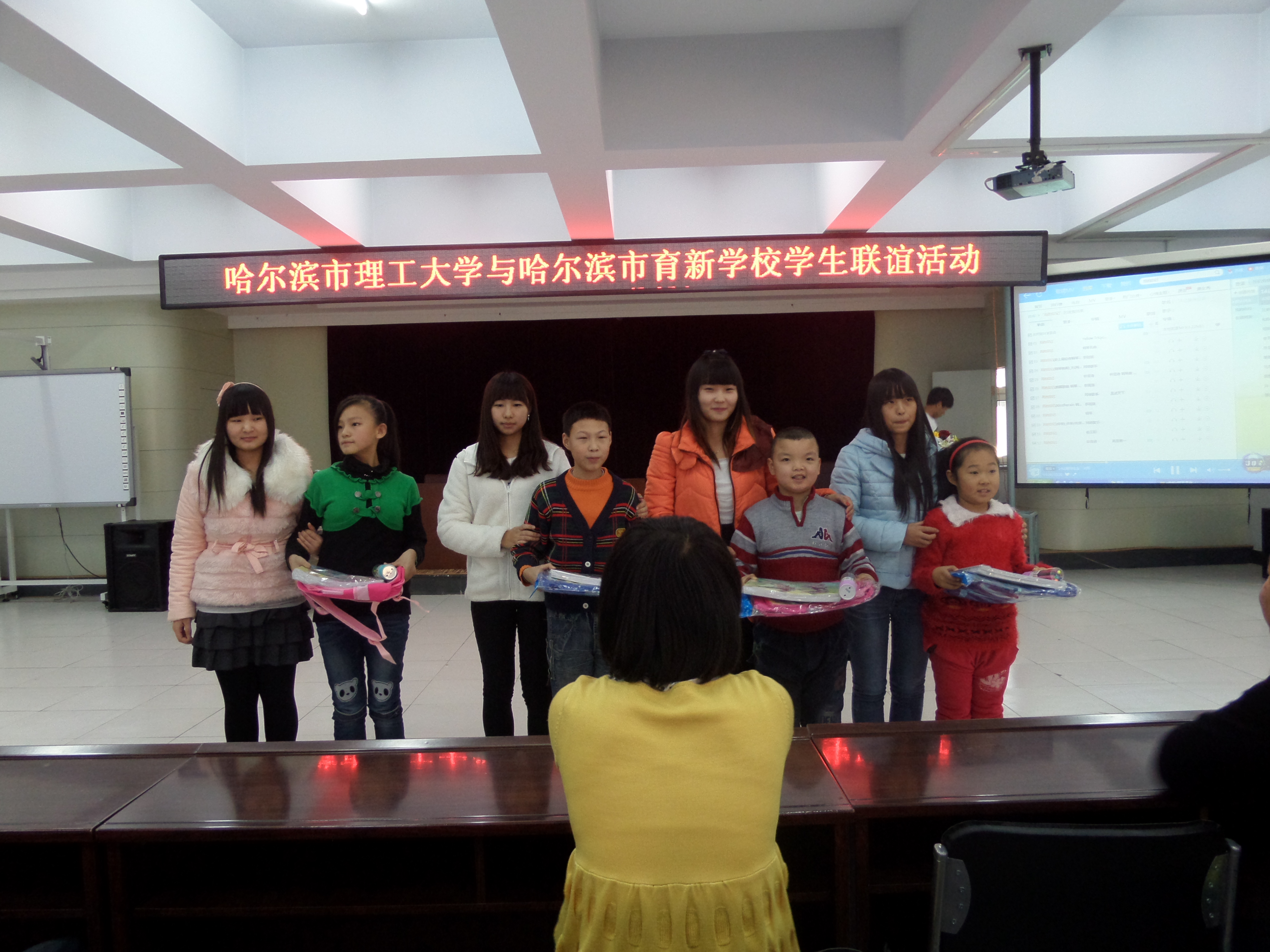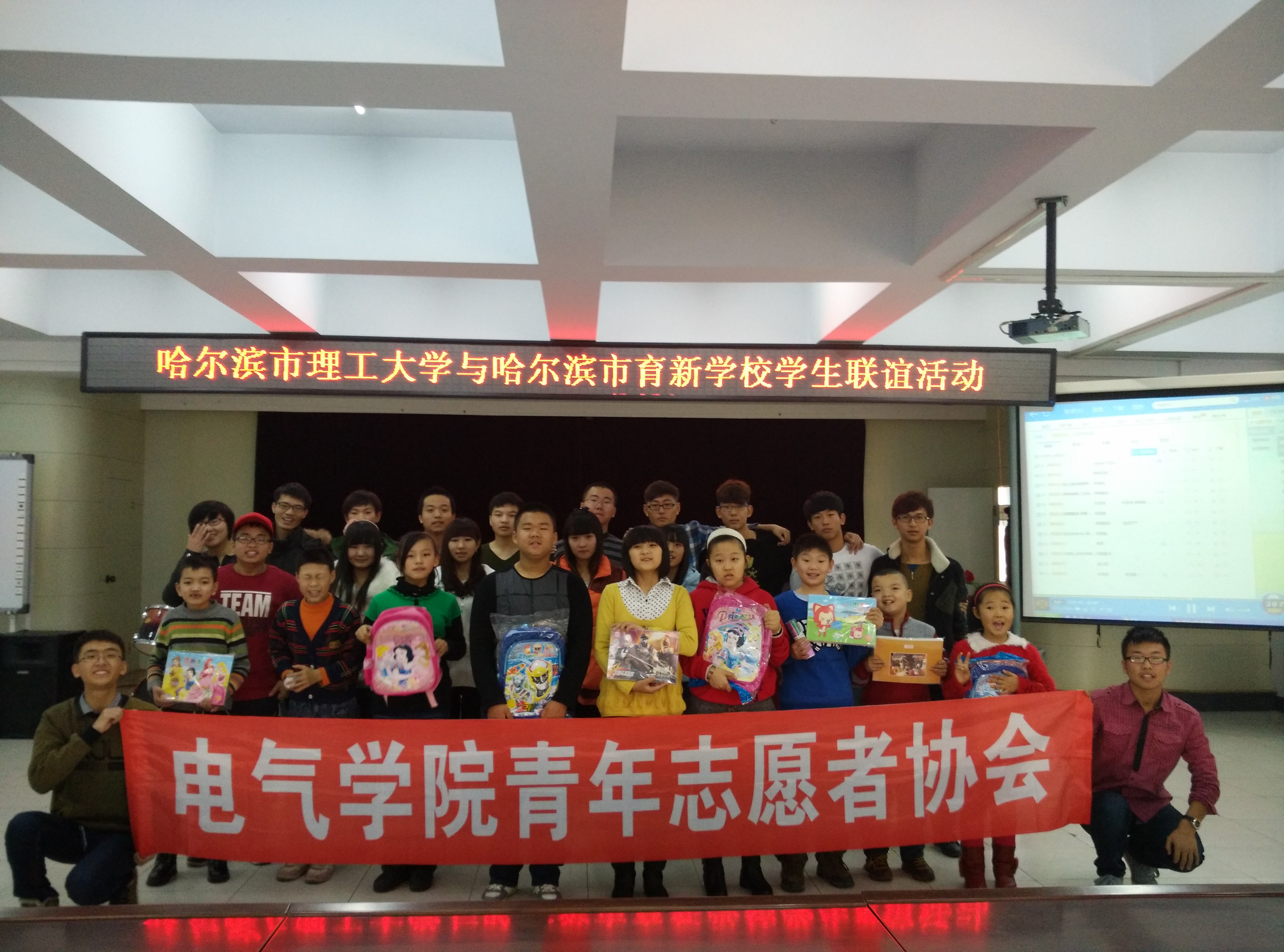2014年11月24日,由哈尔滨理工大学电气学院青年志愿者协会组成的志愿者团队踏着午后温暖的阳光,来到了残障儿童学校——育新小学,开展了与育新小学的联谊活动,此次活动意在为小朋友送去温暖,让小朋友感受到志愿者的关怀与奉献,同时在他们童年的世界里画下多彩的一笔。