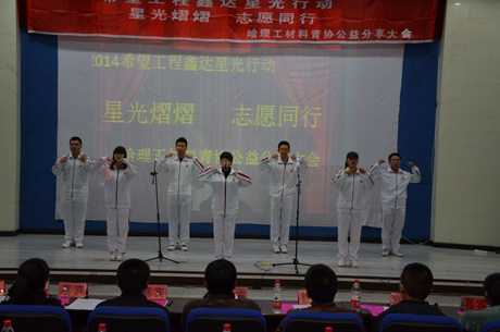 青春如歌,是志愿者们用最优美的声线绘出的华丽音符。踏寒寻梅,暗香浮动,今夜,志愿者们尽情绽放光彩,再一次贡献自己的力量将爱心挥洒!2014年11月28日晚上18:00,哈尔滨理工大学材料学院青年志愿者协会在南区图书馆报告厅三楼举行了2014希望工程星光鑫达行动“星光熠熠 志愿同行”哈理工材料青协公益分享大会,莅临本次晚会的嘉宾有黑龙江省青少年发展基金会王一卓、星光行动指导教师、黑龙江省大众社工中心理事长付海涛、校团委副书记姜国玉、材料学院党委副书记、副院长李国辉、校团委曹石以及材料学院全体辅导员。材料学院全体志愿者及大一部分学生参加了此次公益分享晚会。