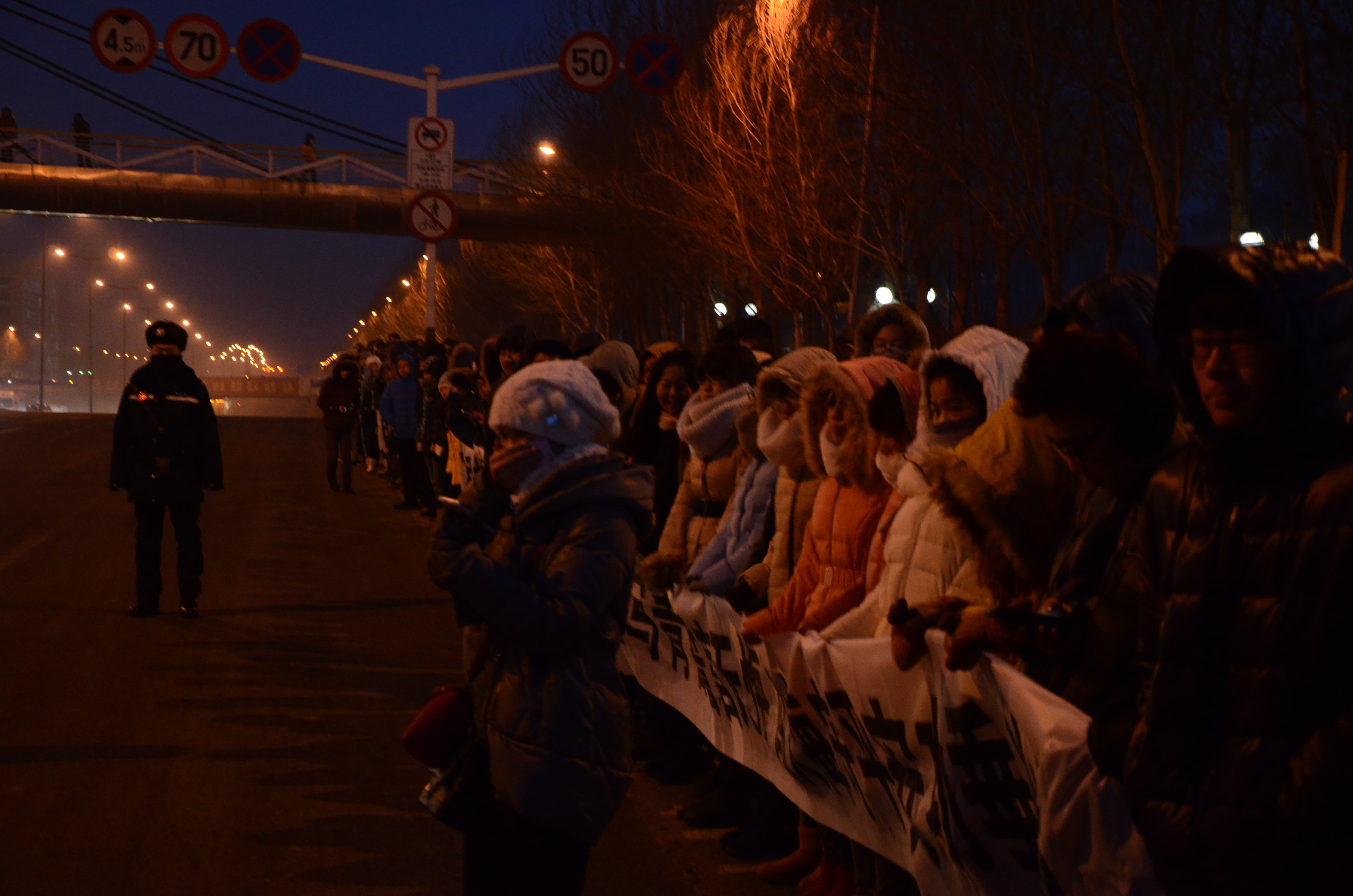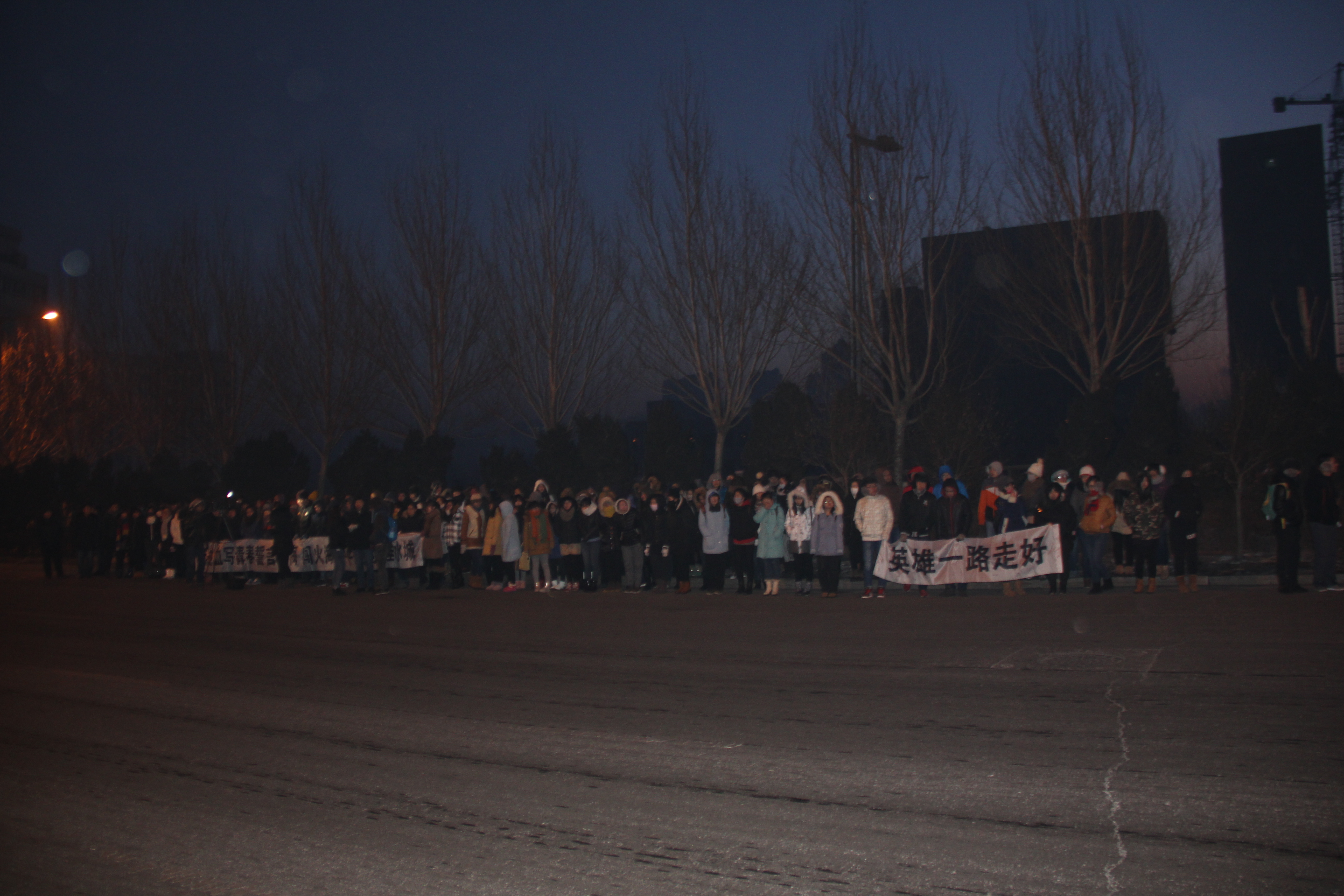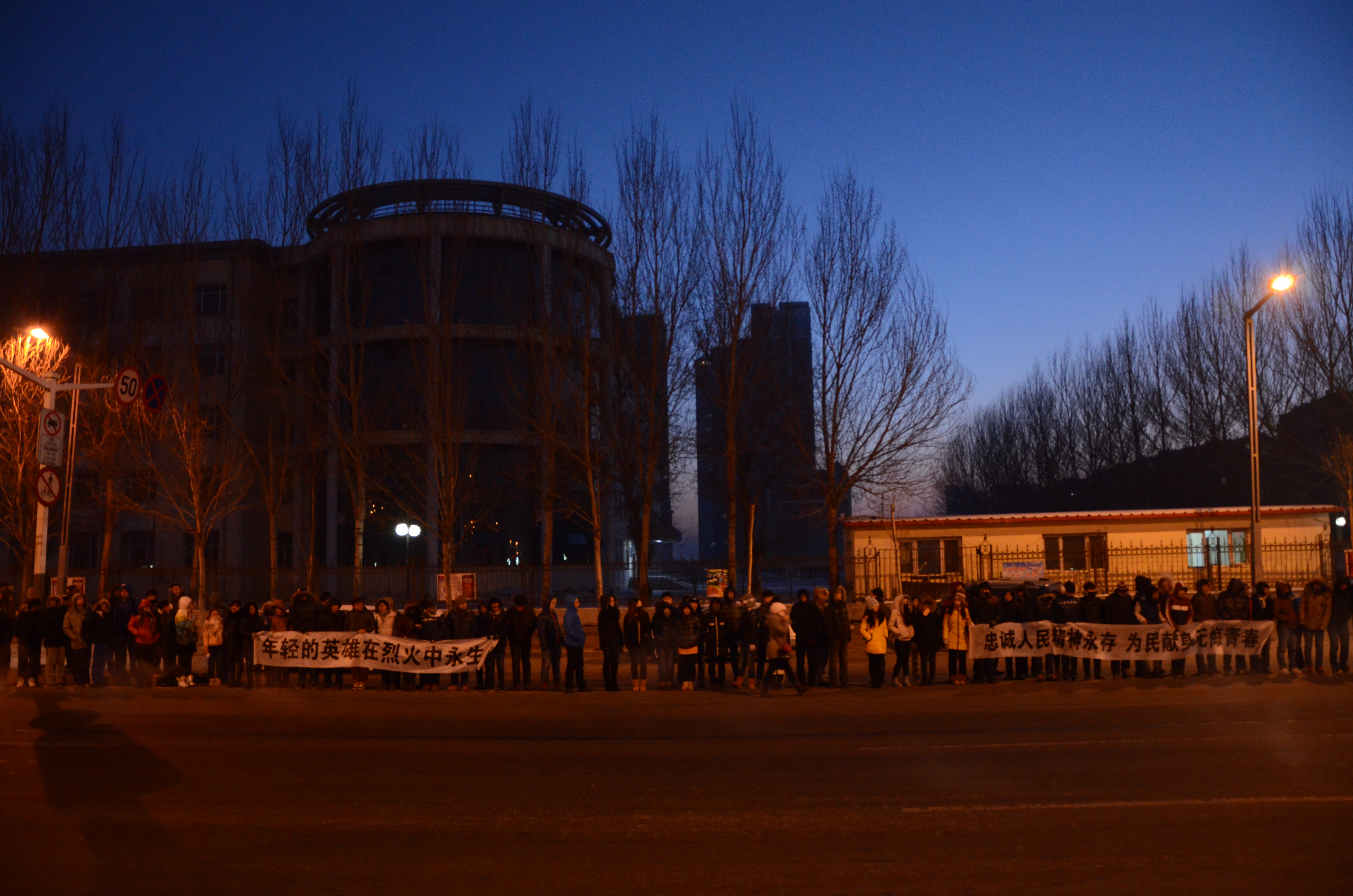 早6时,当承载着英雄们的灵车缓缓驶过征仪路桥附近时,外国语学院、化工学院、经济学院、材料学院、管理学院、艺术学院等学院的千余名同学以及部分教师在寒风中等候近半个小时为英雄送行。同学们拉着写有“年轻的英雄在烈火中永生”、“忠诚人们精神永存 为民献身无悔青春”的横幅,集体向英雄们的灵车行注目礼,送英雄走完最后一程。此刻,心中的悲痛和哀悼全部化作哽咽在喉中的一句话:英雄们请一路走好!