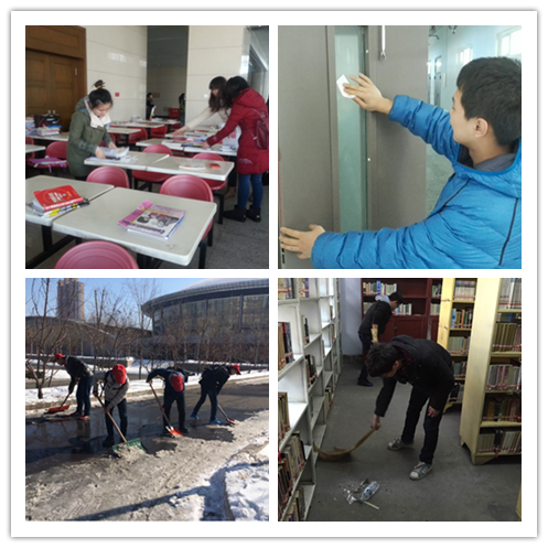 左一:材料学院清扫冰雪 右一:测通学院整理图书