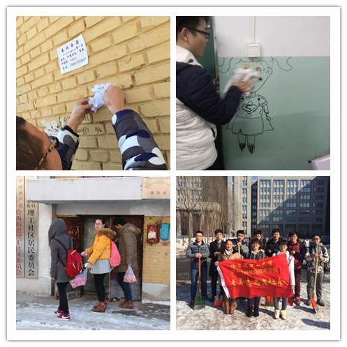 3月5日,校青年志愿者协会通过学校主页、“理工青年”微信平台向全校同学发出倡议书,倡导大家努力做到:学习雷锋勤俭节约、热爱集体、助人为乐的精神,用实际行动践行雷锋精神,争做文明大学生。开学伊始,青年志愿者协会、校级学生组织社团以及各学院青年志愿者协会组织志愿者开展内容丰富、形式多样的志愿服务活动:计算机学院青年志愿者协会的同学们,利用中午午休时间,将新主楼E区15楼学院的宣传栏等橱窗设施擦拭一新,同时还清理了通向新主楼的人行道上的冰面方便老师和同学们出行。法学院青协为了给师生们创造良好的教学环境,活动日当天法学院青年志愿者们对青协活动室及东区部分教室进行了彻底的打扫,去除墙体涂鸦。建筑学院青年志愿者协会的志愿者们对西区校园内的各种小广告进行了清理,对学生公寓内楼道地面的口香糖清理。测通学院、软件学院青年志愿者协会都组织志愿者前去图书馆开展志愿服务活动,每一个志愿者细心的整理每一本图书,清扫每一个角落,并一直保持安静,不影响其他周边的同学。外国语学院青年志愿者们分为三支服务小分队,分别对南区图书馆卫生打扫,清理广告,整理书桌,提高图书馆整洁度,为同学打造舒适的学习环境对校园下坡地面余冰清理,为广大同学的出行提供安全保障;在教室打扫卫生,清理桌面,为下一个上课的班级提供良好的环境。艺术学院青协志愿者们利用自身的专业优势,在黑板上绘制宣传雷锋精神的板报,为弘扬雷锋精神贡献自己的一份力量,也将美丽的色彩带到了各个公寓。我校第二届研究生支教团成员在百威英博爱心小学开展学雷锋主题团日以及趣味足球赛活动,课堂上小学生们热情高涨,气氛活跃。校学生会在西区一食堂、二食堂为学生们营造了良好的就餐秩序,维护排队打饭队伍的秩序,帮助食堂的工作人员清扫地面,清洁桌子,呼吁同学们树立起反对浪费,崇尚节约的良好风尚,对“舌尖上的浪费”说不,让勤俭节约的风气深入人心,呼吁同学们自觉维护食堂卫生,不随手扔垃圾,从点滴做起,用行动去续写雷锋精神,结合文明校园,开展文明及禁烟标语张贴和宣传活动。校广播台志愿者们组织前往理工社区慰问社区贫困家庭,并与其建立起帮扶结对,定期去结对家庭开展志愿服务活动,为孤寡老人送去温暖与爱心。青年志愿者协会、材料学院青年志愿者协会、校科协、大学生讲坛等学生组织同时开展了清理校园冰雪、捡拾垃圾活动,志愿者们用实际行动助力文明校园创建 , 彰显了青年志愿者良好的精神风貌。