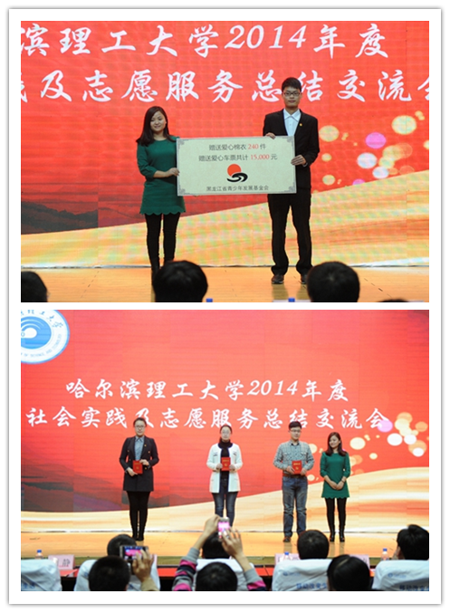 在第二篇章“希望传承”中,来自“希望工程激励行动”艺随益动团队的刘梦雪同学代表我校“希望工程激励行动”、“黑龙江省星光行动”所有项目团队发言,她系统全面的介绍了艺随益动团队项目并饱含深情的讲述了作为理工院校的艺术生们不怕吃苦、肯于学习、热心公益的种种努力,将专业学习与公益梦想相结合,做一群大家眼中不一样的艺术生。正是他们的不懈努力和无悔付出,使得我校艺随益动团队“创意手工的商业运作与公益价值的体现”被评为全国2014年度希望工程激励行动优秀项目,全国共有35个项目获此殊荣。同时,材料学院青年志愿者协会《远离手机鸦片,享受健康生活》项目和校青年志愿者协会PC先锋服务队《修机换芯》项目也被评为2014希望工程鑫达星光行动团队合作奖;材料学院“保健型控温电热毯”的商业化运作的公益推广被评为2014希望工程鑫达星光行动项目创新奖。黑龙江省青少年发展基金会副秘书长刘静为获奖团队代表颁奖,同时也向我校特困大学生代表捐赠了240件羽绒服,和一万五千元爱心车票,帮助我校特困学生温暖过冬,送爱回家。