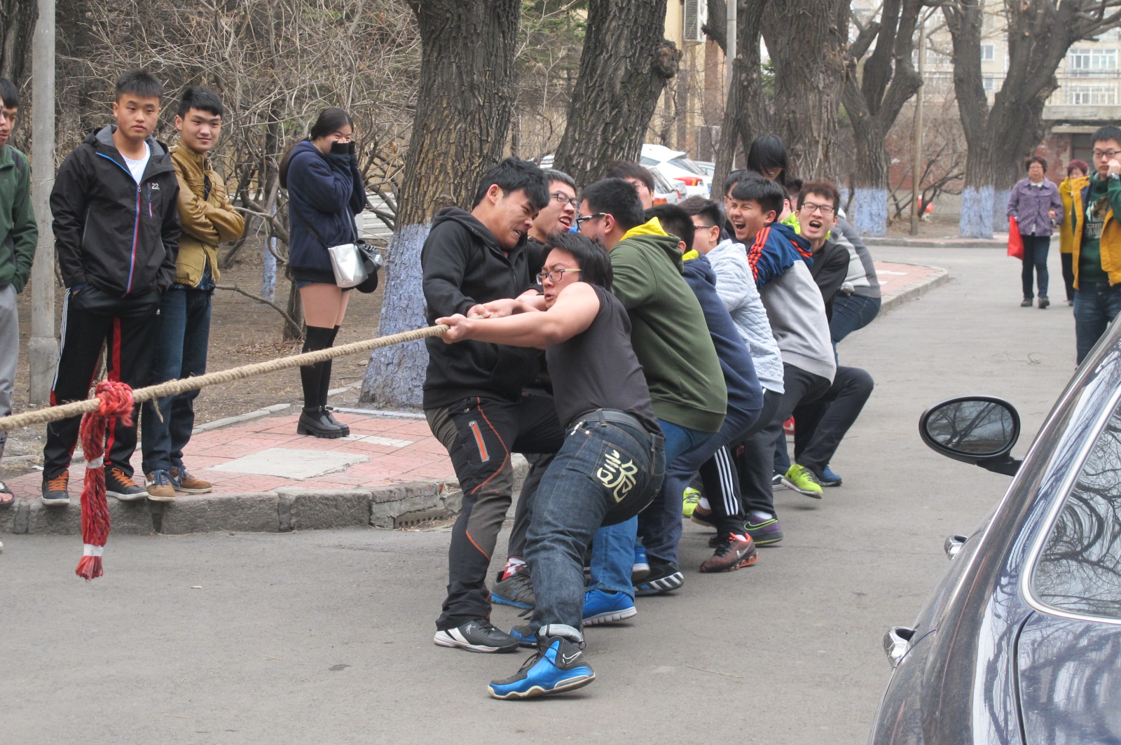 拔河比赛中,每个班级选出了班级半数以上的同学参加比赛。在比赛时,两边的拉拉队喊着口号,参赛的同学不论男生还是女生,都用尽了自己最大的力量去赢得比赛。有时在比赛中,有的班级的同学因不小心摔倒而输掉了比赛,这时作为对手的班级都会毫不犹豫的去主动的扶起他们,这充分的体现了“友谊第一,比赛第二”的原则。所以本次拔河比赛,不仅锻炼了同学们的意志和协作能力,同时也展现了同学之间的深厚友谊。