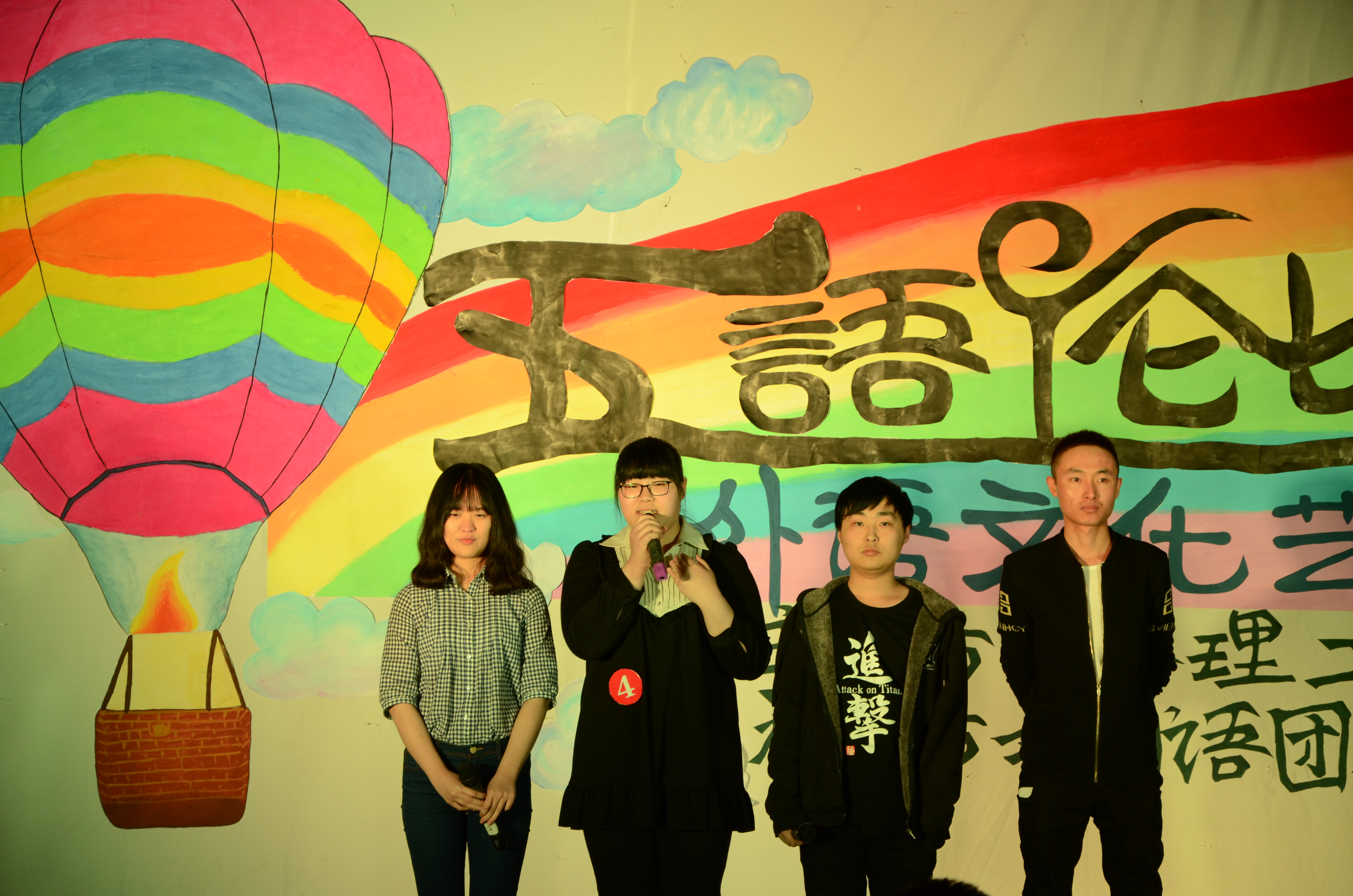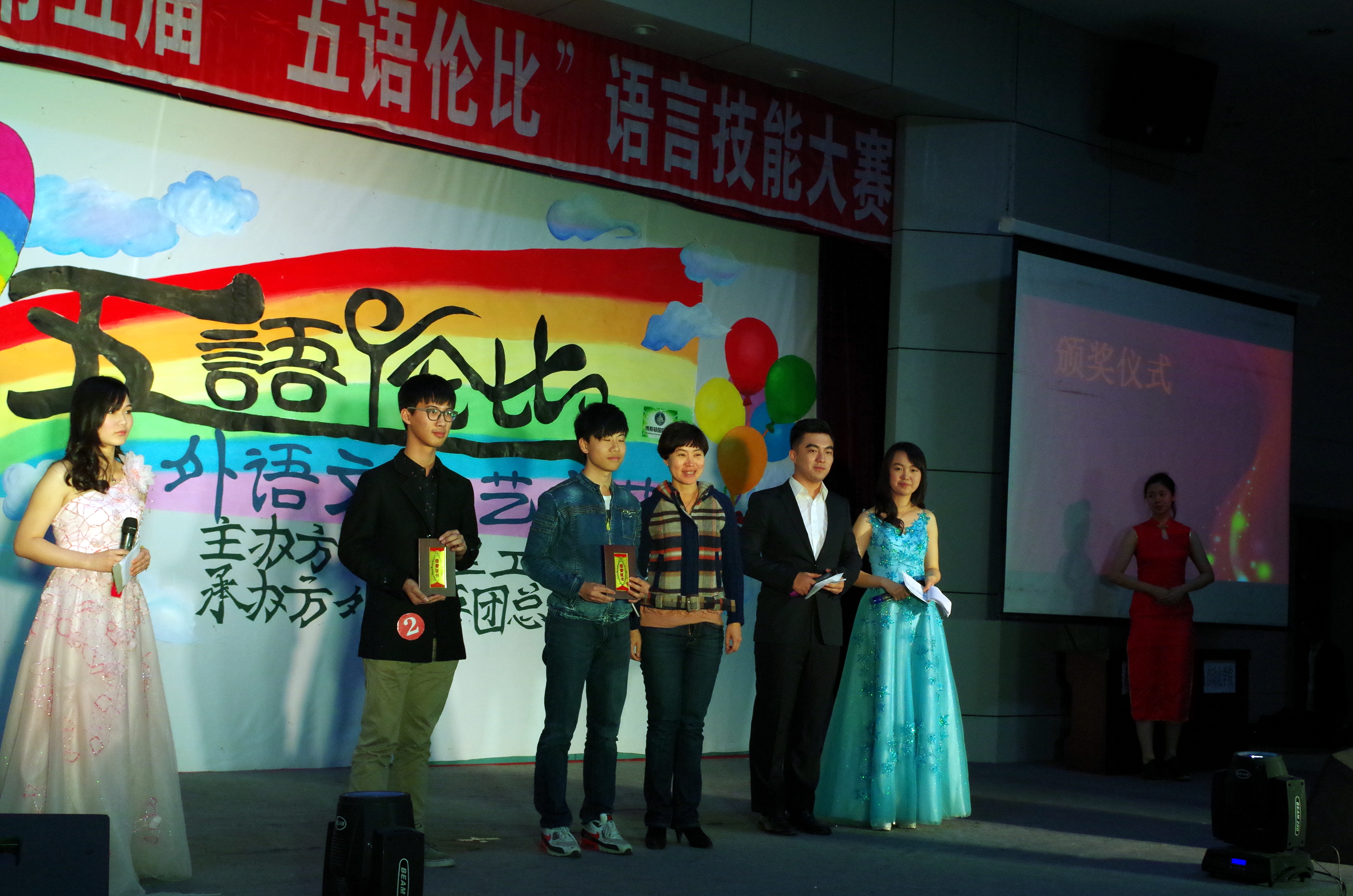 外国语学院第五届“五语伦比”语言技能大赛于5月15日晚六点在西区1号楼0220圆满落幕。出席本次比赛的评委有:工会副主席綦开军、团委副书记姜国玉、教务处副处长徐永明、英语系副主任马艳辉、日语系武文婷老师、俄语系王欢老师、朝鲜语系李晓晨老师。出席本次比赛的嘉宾有:外国语学院党委书记高秀江、外国语学院副院长郭红、外国语学院党委副书记周晓丽。
