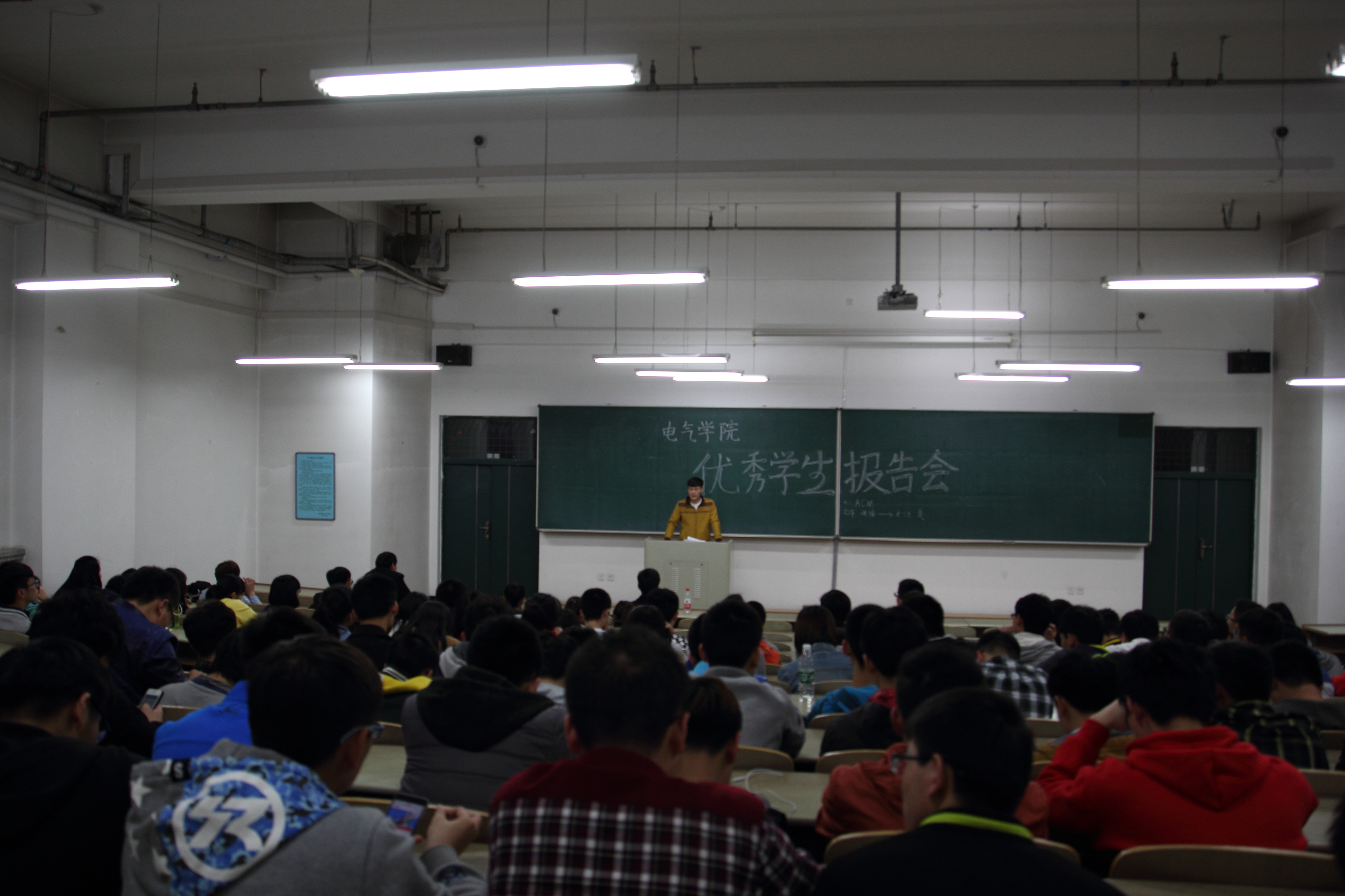 “榜样的力量是无穷的”。榜样是人前进和前行的目标、动力和向导。它带给我们的是无尽的锐气、朝气,是必胜的信念,是永无止境的力量源泉。向先进学习,向榜样看齐,是大学生奋斗拼搏的力量。为丰富校园生活,促进学风建设,激励大一的同学们积极向上、刻苦学习、乐观进取,坚定“三个自信”和牢固树立“四信”。电气与电子工程学院在新主楼H501举行优秀学生报告会,邀请学院12-8班陈戢同学和12-9班王鹏同学分享他们的学习生活和成功经验。团总支书记张路杨老师,辅导员张宏亮老师,2014级全体大一学生聆听本次报告会。