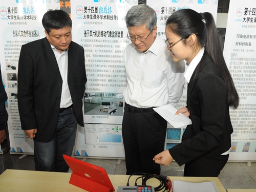 比赛开始前,我校参加全国大学生机器人大赛的探路者战队进行了现场表演,现场气氛火爆。随后,校长李大勇、党委副书记孟上九为学生课外学术科技作品展揭幕。比赛开始后,嘉宾和评委依次听取了同学们介绍他们的作品,不时还向同学们询问作品情况。决赛现场,各个展台前都围满观展学生,本次比赛也吸引了很多爱好科学创新的同学来参加,在机器人和四旋翼飞行器等目前比较热门的展台前就站满了大批爱好者们,他们同参赛选手讨论研究制作过程中的经验及遇到的困难。本次比赛不但有这些"高大上"的作品,也有一些贴近生活的发明创造。“每当我出差,家里的花就没人浇水,你的发明可以很好的为我解决这个问题,如果投入生产进入市场,我第一个买!”自动定时浇花装置的展台前,一位老师说到。除此之外,还有很多发明创造是为工厂里的大型设备设计的,“在离散分频软启动设备”的展台前,参赛同学向老师介绍了这种设备的原理及用途,比赛在活跃的气氛中有序的进行。
