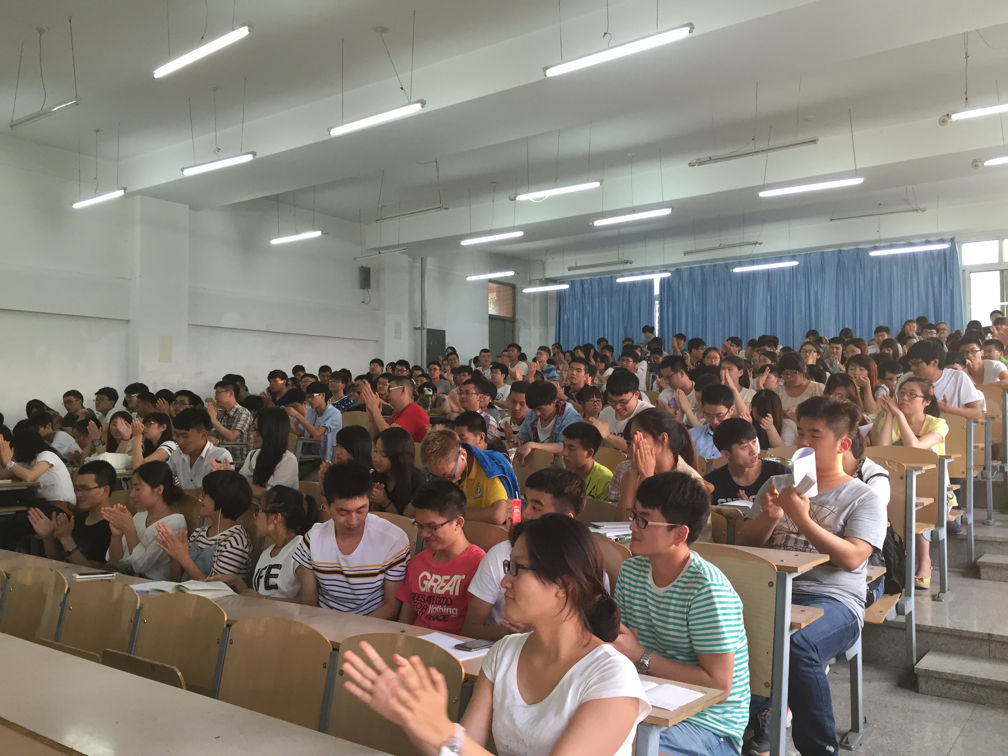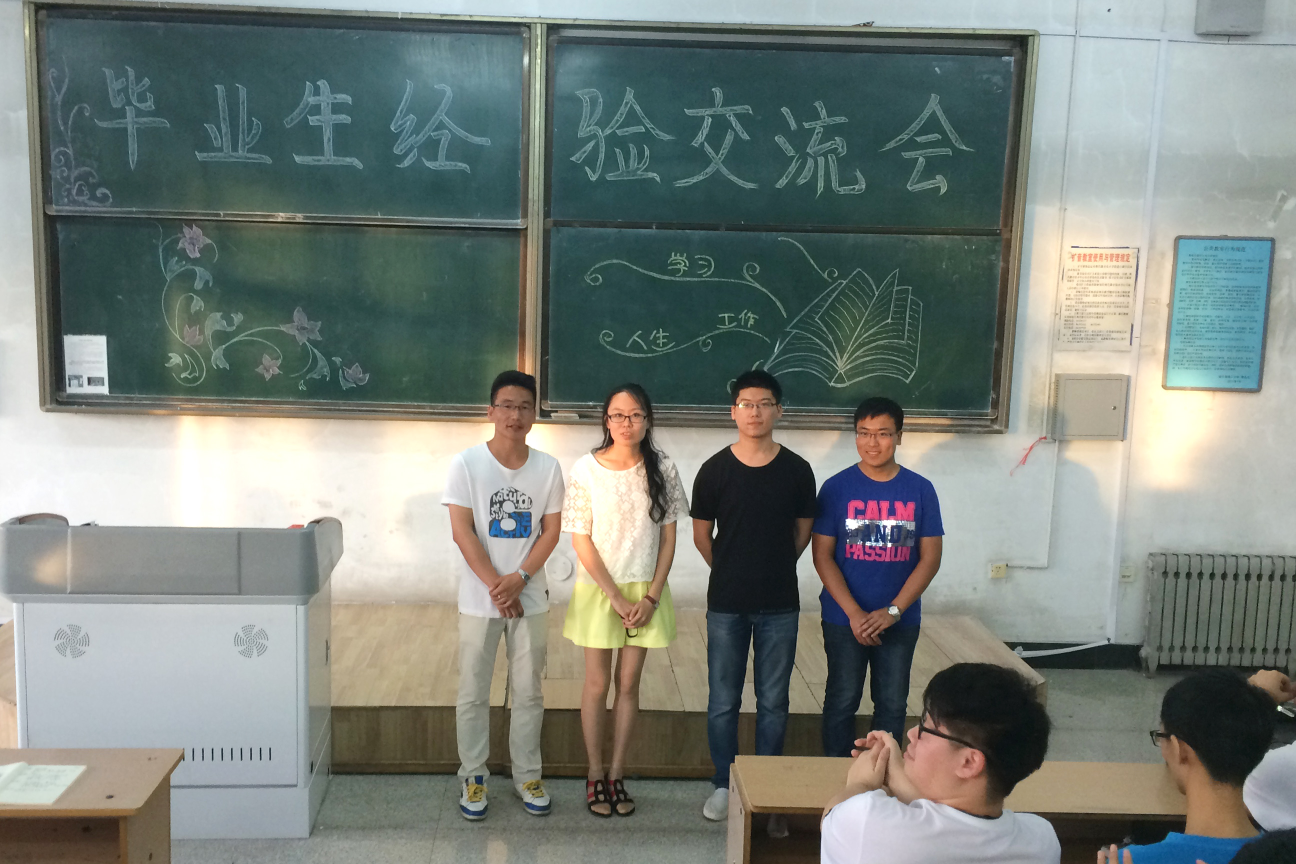 7月3日14:00在化工楼508会议室,2015届毕业生材化11-2班郭佳、化工11-2班郭建成、化工11-2班孙博天给大三80余名学生做了经验交流;17:30在南区三号楼206教室,郭佳、郭建成、孙博天及环境11-1班毛新博同大二年级的两百余名学生分享了他们在考研、就业、学习和生活等方面的经验。经验交流会上,即将毕业的大四学生,带着对母校的感恩、眷恋之情,以过来人的亲身感受,针对找工作、考研、谈恋爱、勤工俭学、二次答辩等在校大学生普遍关注的问题,为大二、大三的学弟学妹们提了很多有价值的意见和建议。交流会现场,同学们积极互动,不时传出同学们热烈的掌声。