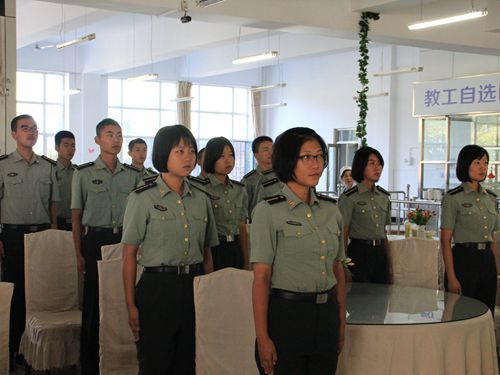 我校国防生在食堂一同观看阅兵式