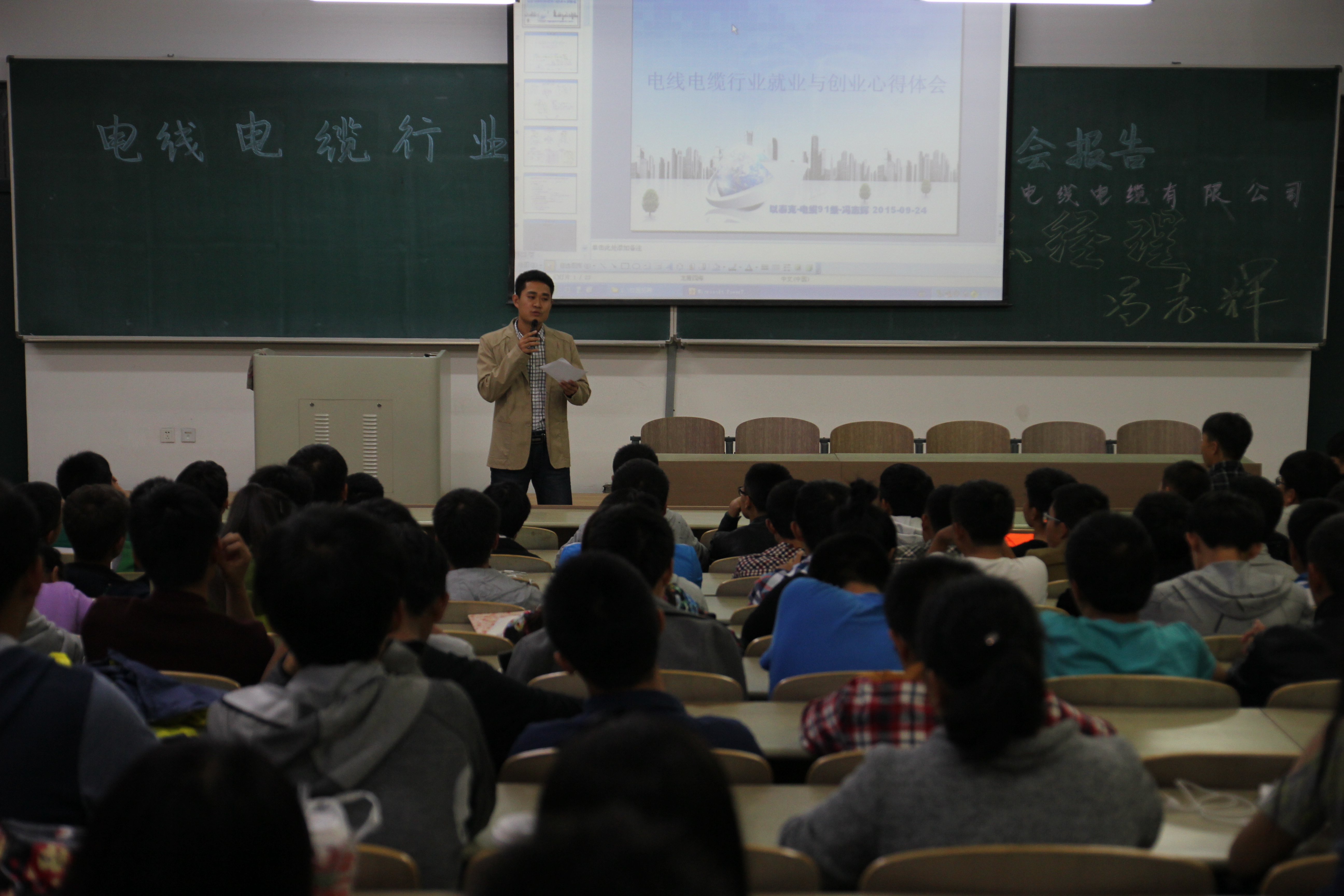 为进一步加强我院大一新生对所学专业的了解,深化对行业现状及发展前景的认识,明确自身定位,提早开展职业生涯规划,电气与电子工程学院于2015年9月24日18:00在新主楼H501,召开电缆、高压专业新生专业教育讲座。我院特邀请我校91级电缆专业优秀校友、现任惠州市以泰克电线电缆有限公司总经理的冯志辉先生为新生做讲座。电气学院党委副书记杨芳、15级新生辅导员周广以及电缆、高压专业的200余名新生聆听了此次讲座。