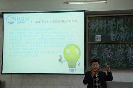 在圣诞节元旦及寒假兼职用工潮来临之前,为了让更多的同学得到能力提升和勤工助学的机会。2015年11月21日下午2时许在理工南区3号楼106哈尔滨理工大学材料学院勤工助学中心携手科林艾尔生态智能科技有限公司及101兼职网举办了冬季大型兼职招聘会。