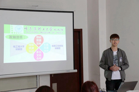 参观结束后,在启航活动中心多媒体室,校史馆讲解团成员与哈工程校史馆学生讲解团进行了座谈,双方分别由讲解部部长常彬(哈工程)、网络宣传部部长于学健(哈理工)分别展示PPT讲稿,就校园文化、讲解技巧及培训、新媒体技术应用、组织机构管理以及特色文化活动等方面进行了交流与探讨。双方表示愿意保持学生讲解团进行更深层次的交流与合作,努力做好大学生校园文化建设与宣传工作。
