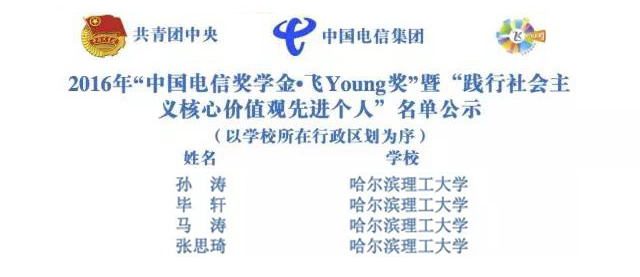近日,“中国电信奖学金”暨“践行社会主义核心价值观先进个人”评选结果揭晓,我校孙涛、毕轩、马涛、张思琦四名学子荣获“中国电信奖学金·飞Young奖”暨“践行社会主义核心价值观先进个人”。 “中国电信奖学金”是由共青团中央、中国电信集团公司、全国学联联合设立,旨在为在广大青年学生中深入开展培育和践行社会主义核心价值观活动,同时发掘、树立、宣传优秀青年学生典型。我校团委根据相关精神,积极组织学生申请、学院推荐、领导专家联合评审,经过各级评审会的选拔,最终我校四位学子喜获该项荣誉,在哈尔滨理工大学青年学生中树立社会主义核心价值观青年典型,激励我校学子勤奋学习、积极进取、全面发展。