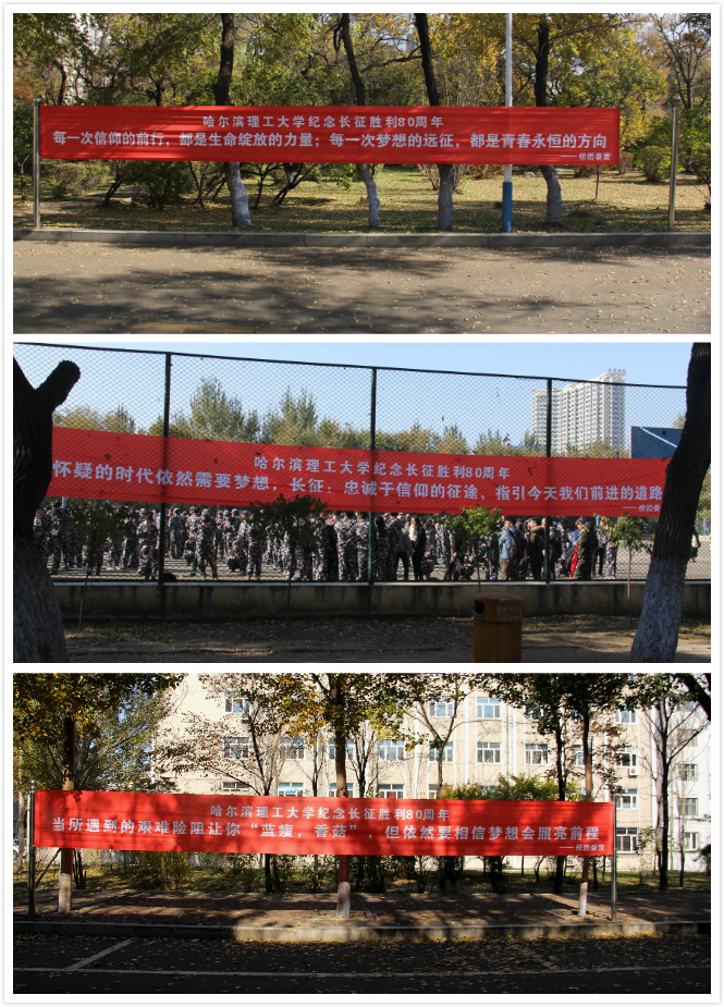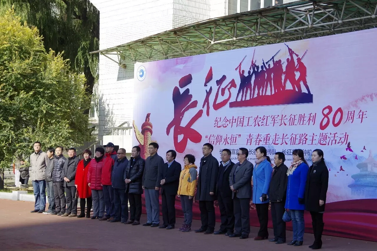 为纪念中国工农红军长征胜利80周年,弘扬民族精神,激发爱国热情,由校团委主办的“信仰永恒”青春重走长征路主题活动于10月22日10时在西区休闲运动场成功举办。校党委书记赵国刚出席纪念活动并宣布活动启动,校党委副书记陆岩为活动鸣枪,副校长满春涛为“红一、二、四方面军”和“红二十五军”授旗。党委常委、宣传部部长周长群,校办主任刘侠,校团委副书记姜国玉,学生处副处长初春艳、张颖,各学院主管学生工作的书记、副书记、团总支书记、学生会指导教师及共有来自全校18个学院千余名学生参加本次活动。校党委副书记陆岩接受媒体采访,哈尔滨电视台、黑龙江日报、新华网、人民网、东北网、新浪网、中国网等10余家媒体对本次活动进行了宣传报道。