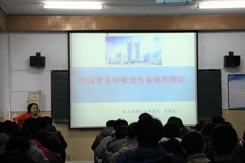 贾程之是《大学生健康教育课程》的主讲教师,负责健康教育工作多年,本次讲座结合2017年11月28日黑龙江省教育厅颁发的《省教育厅关于加强学校冬季呼吸道传染病防控工作的通知》(黑教体函[2017]611号),主要讲解了五种校园常见的呼吸道传染病:流行性感冒、水痘、麻疹、风疹和肺结核。介绍了这些疾病的传播方式、临床表现、健康危害及校园预防措施。着重介绍了呼吸道传染病的预防:经常开窗通风,搞好环境卫生,不要随地吐痰,勤洗手、多喝水、不吸烟、不酗酒,经常锻炼身体,保持均衡饮食,注意劳逸结合,提高自身抗病能力,要根据天气变化适时增减衣服避免着凉,应尽量避免经常到人多拥挤的公共场所,如果有发热、咳嗽等症状应及时到医院检查治疗。每个大学生应当拥有公德意识,当自己发生传染病时,积极诊疗,应主动与健康人隔离,尽量不去公共场所以免防止传染他人,不要滥用药物,在医生的指导下规范诊疗管理,杜绝隐瞒病情,不能损害其他同学健康,更不允许传染病的爆发流行。