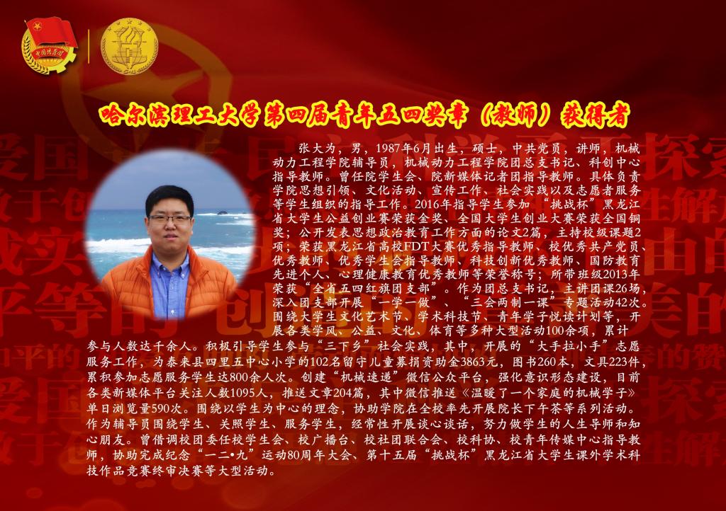 编者按:一百年前,鲁迅先生寄语中国青年:此后若没有炬火,我便是唯一的光。国破危亡之际,为真理正义披荆斩棘,为对抗封建糟粕视死如归,“五四”运动力挽狂澜。从此,青年,崛起!一百年后,习近平总书记厚望当代中国青年:要爱国,忠于祖国、忠于人民;要励志,立鸿鹄志、做奋斗者;要求真,求真学问、练真本领;要力行,知行合一、做实干家;要有社会主义建设者和接班人的使命担当。奋斗是青春的底色,行动是最好的传承。弘扬“五四”精神、鼓舞青年斗志离不开榜样的力量。在纪念五四运动99周年之际,我校又涌现出一批“哈尔滨理工大学青年五四奖章”获得者。他们信念坚定、脚踏实地、奋发进取,展现了理工青年的时代风貌和价值追求。今天,让我们再次走近这些身边的优秀青年,一起向奋斗的青春致敬,以榜样的力量激励和引导我校广大青年为强校建设奉献青春智慧和力量。