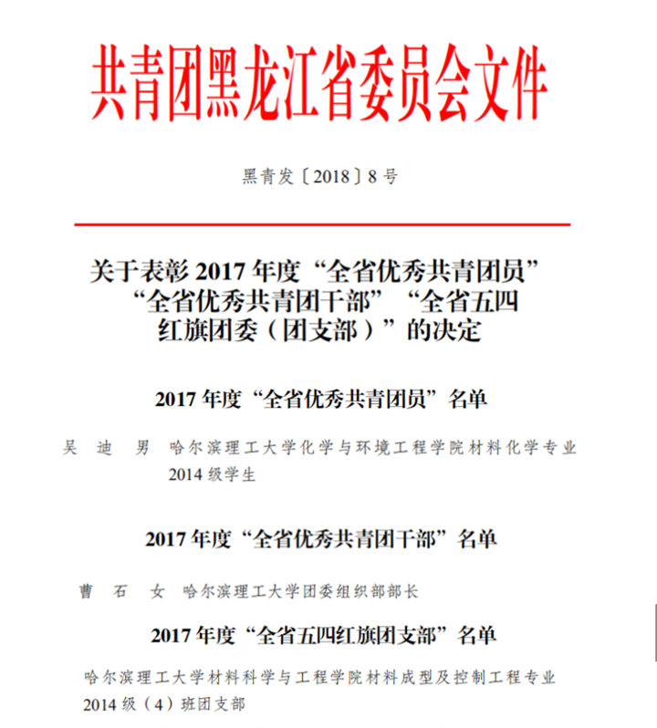 5月25日,2017 年度“全省优秀共青团员”、“全省优秀共青团干部”、“全省五四红旗团委(团支部)”评选结果揭晓,我校团委曹石荣获“黑龙江省优秀共青团干部”,化学与环境工程学院材料与化学专业2014级吴迪同学荣获“黑龙江省优秀共青团员”,材料科学与工程学院材料成型及控制工程专业 2014 级(4)班团支部荣获“全省五四红旗团支部”。这是继我校材料科学与工程学院材料成型及控制工程专业 2014 级(4)班团支部荣获全国五四红旗团支部后,我校团组织建设取得的又一项荣誉。