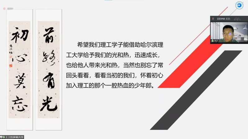 5月28日晚18:30,哈尔滨理工大学经济与管理学院专业学位中心主任,黑龙江省普通本科高等学校青年创新人才,黑龙江省重点培育智库“黑龙江省人口经济与人才发展战略研究中心”专家,黑龙江省经济学会理事,第7届“哈尔滨理工大学五四青年奖章”的获得者,王卫老师做客第549期大学生讲坛,通过腾讯会议的方式,为理工学子带来题为“学党史、强信念、跟党走--但行好事,莫问前程,前路有光,初心莫忘”的精彩讲座。