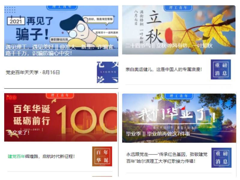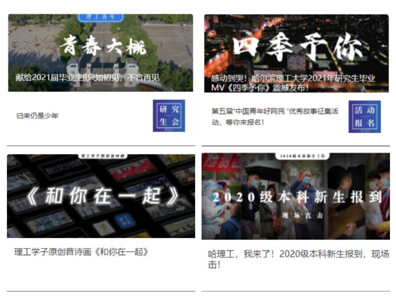构建“互联网+共青团”工作格局。结合青年喜闻乐见的方式,探索符合青年特点的宣传话语体系,发挥校园新媒体矩阵多维覆盖作用,培育积极健康、向上向善的网络文化,打造“有态度、有温度、有影响”的哈尔滨理工大学网上共青团组织。围绕纪念中国共产党成立100周年、五四运动100周年、庆祝新中国成立70周年等主题推出系列专题活动。以官方微信公众号“理工青年”为平台,推出《遇见理工,遇见美好》等优质文章。“理工青年”公众号累计发文2237篇,最高阅读量达7.1万人次,总用户数超5.7万。“理工青年”公众号多次在全国高校团委微信公众号综合影响力排行榜上位列前茅。